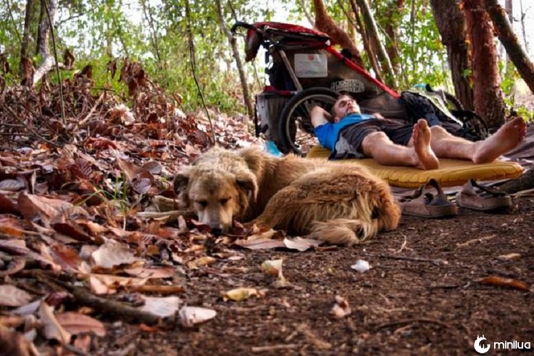 A extraordinária tentativa de um viajante intrépido de atravessar o mundo inteiro com um cão vadio que encontrou no caminho foi temporariamente interrompida pela pandemia de coronavírus.