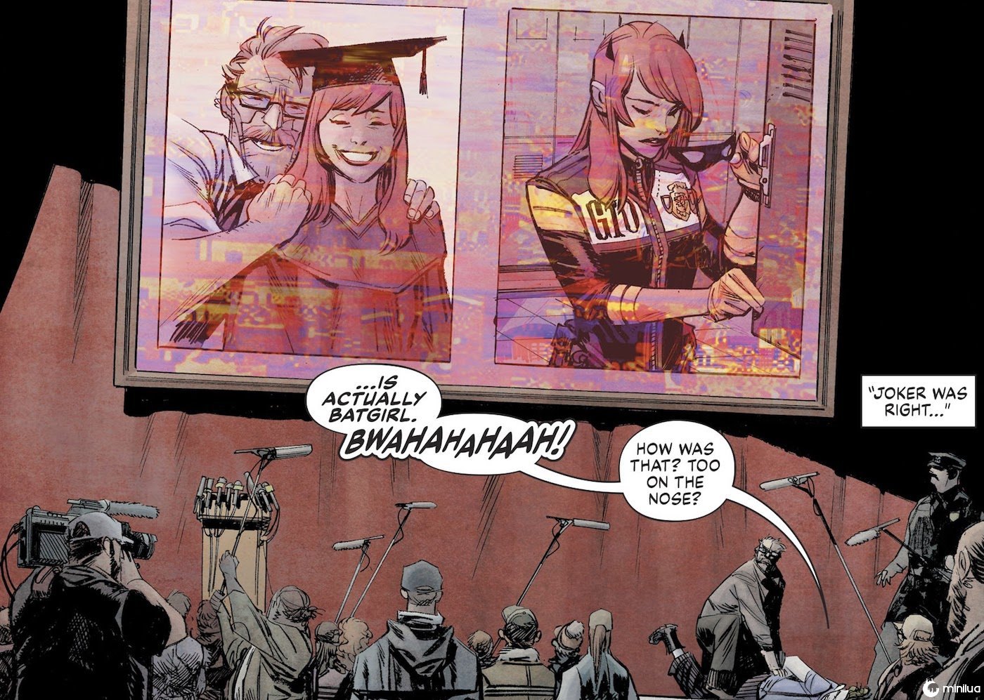 Enquanto é detido pela segurança, ele exibe imagens de Barb desmascarando-a como parte da força-tarefa de Gotham criada por Jack. Esta unidade viu vigilantes como ela e Nightwing (Dick Grayson) trabalhando juntos, e resta saber se Dick também será expulso. É apenas uma questão de tempo, já que Coringa sabe que Bruce é Batman, então, neste momento, é evidente que ele está totalmente determinado a assistir Bruce se contorcer enquanto seus entes queridos sofrem.