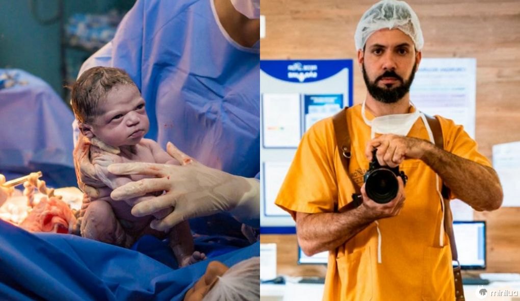 Uma foto do parto na cesariana está tendo um momento viral, graças à expressão épica no rosto do recém-nascido.