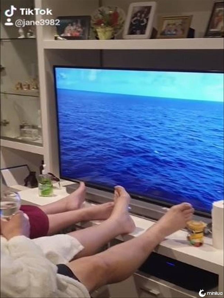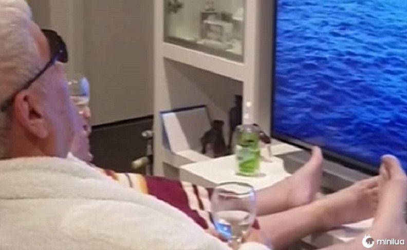 No vídeo, compartilhado no TikTok por sua filha Jane, o casal pode ser visto desfrutando de uma bebida com os pés para cima, imagens do mar na tela da TV na frente deles