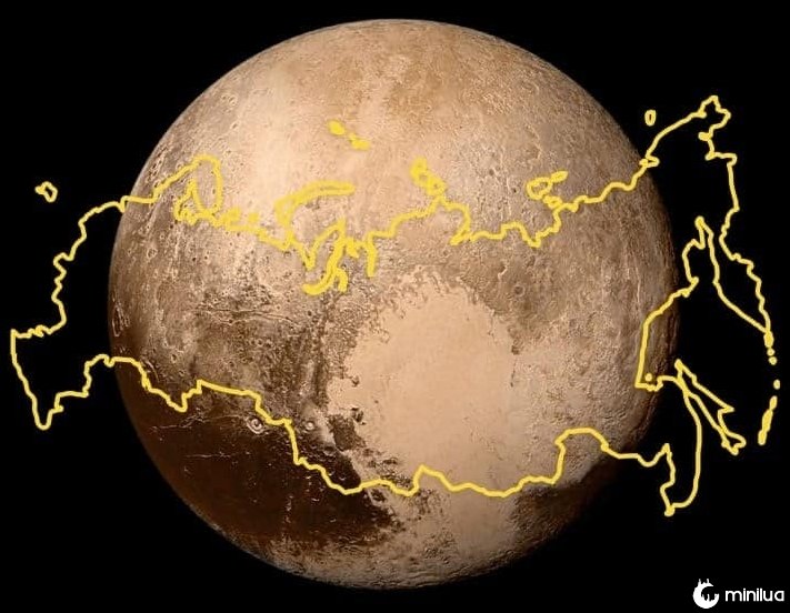A superfície de Plutão é de 17,8 milhões de quilômetros quadrados e a da Rússia é de 17,1 milhões de quilômetros quadrados.
