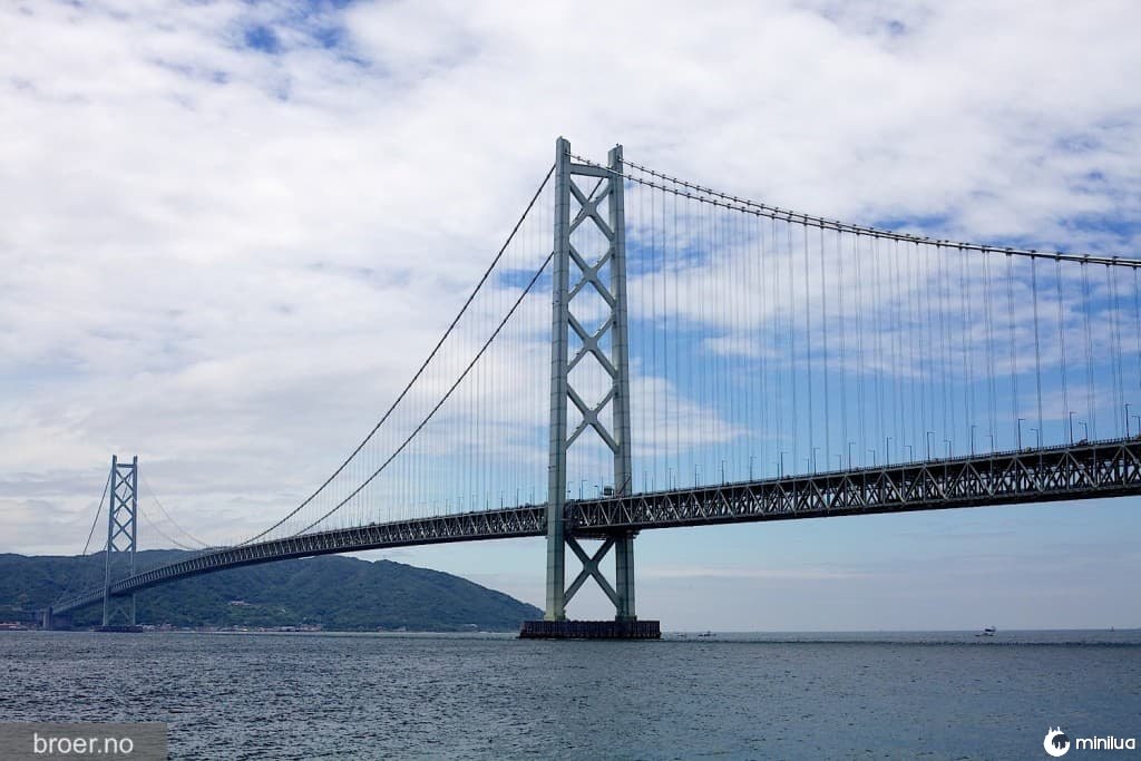 Essa ponte no Japão tem o maior vão central de ponte suspensa do mundo, com 1991 metros. Concluída em 1998, ela tem 3911 m de comprimento total.