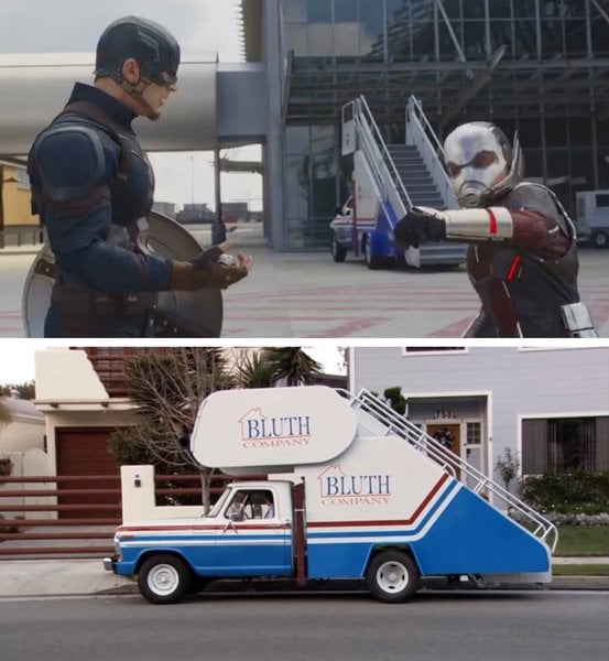 Durante a batalha dos Vingadores no aeroporto, você pode notar um veículo da empresa Bluth Company. Os diretores russos colocaram aquela van que fazia parte da série