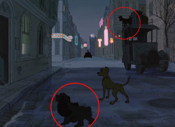 O filme 101 Dálmatas (1961) é um dos clássicos animados da Disney e houve um aceno curioso para o futuro. Neste cenário você pode ver três cães na rua, mas dois deles aparentemente são Lady e o Vagabundo, os protagonistas de A Dama e o Vagabundo que iria ser lançado até 1995.