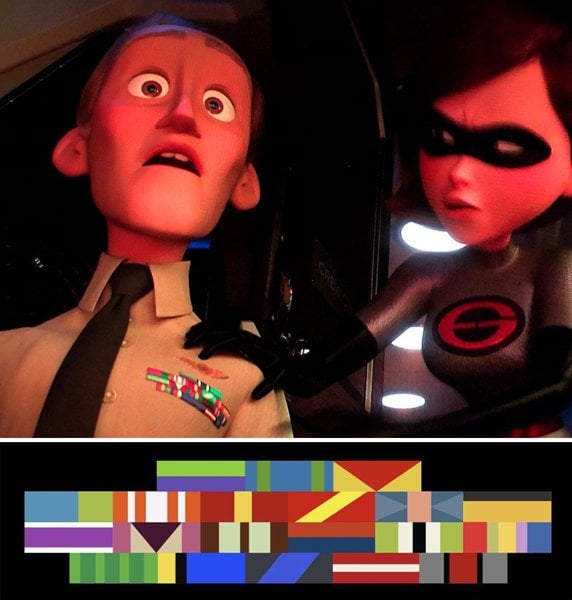 Em Os Incríveis 2 (2018), um dos guardas tem um distintivo no peito. Esse é um símbolo que resume em cores todos os filmes da Pixar até aquele momento.
