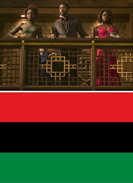 Na cena do cassino em Pantera Negra (2018), T'Challa, Nakia e Okoye usam as cores da bandeira do movimento pan-africanista em seus trajes.