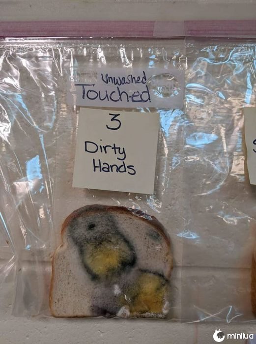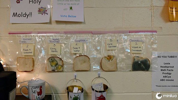 "Como os resultados foram tão chocantes, estudantes e funcionários deram uma virada muito séria em direção a uma melhor higiene. Alunos de diferentes salas de aula de toda a escola vieram à nossa classe para ver pão mofado e aprender sobre lavagem das mãos."