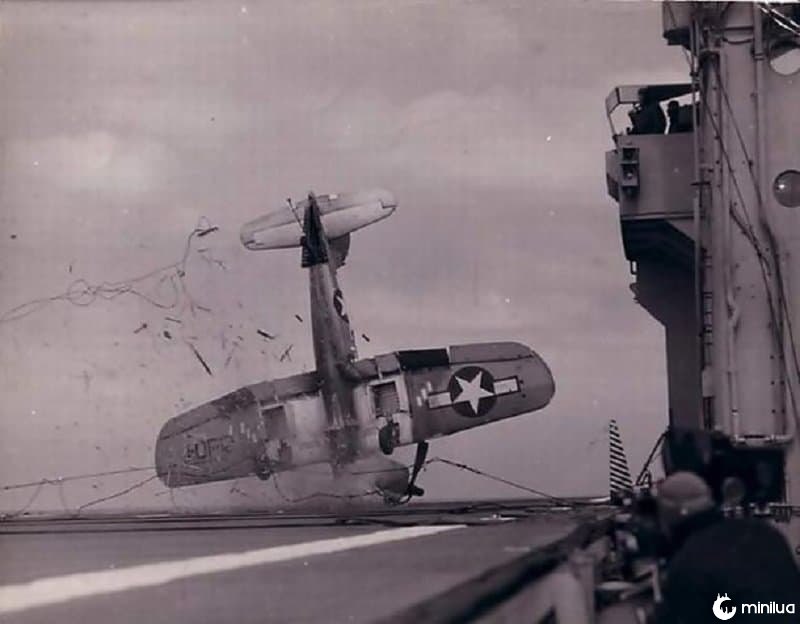 Esta é a fotografia tirada quando o WW2 Vought F4U Corsair caiu no convés de um navio.