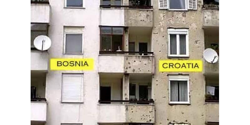 Não é engraçado se o seu vizinho vive em um país completamente diferente no mesmo prédio que você? É interessante ver a notável diferença entre o estado do edifício no lado bósnio e croata.
