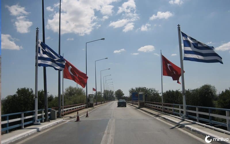 A ponte marca qual lado é a Grécia e qual é a Turquia. Você vai notar novamente a diferença no estado da estrada, poste de luz e cerca usada pelos dois países.
