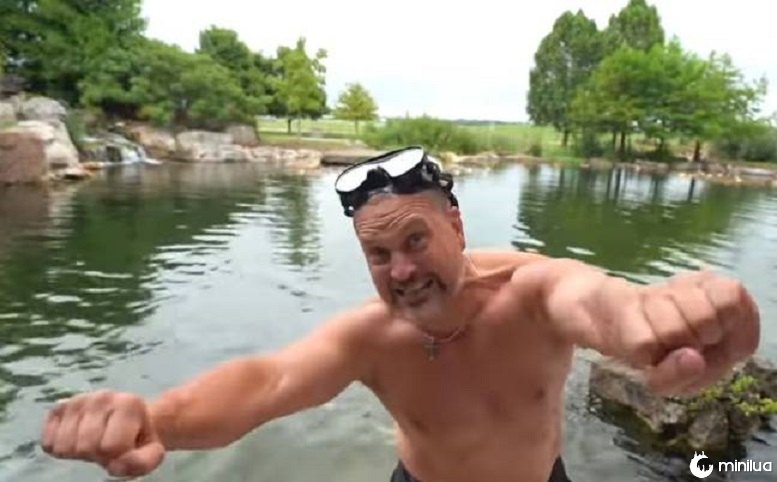 No vídeo publicado on-line, ele pode ser visto usando óculos de proteção bastante ousados antes de entrar na água com seus pesos. Quando o observador se posiciona para garantir que ele não morra, Greg começa o desafio.