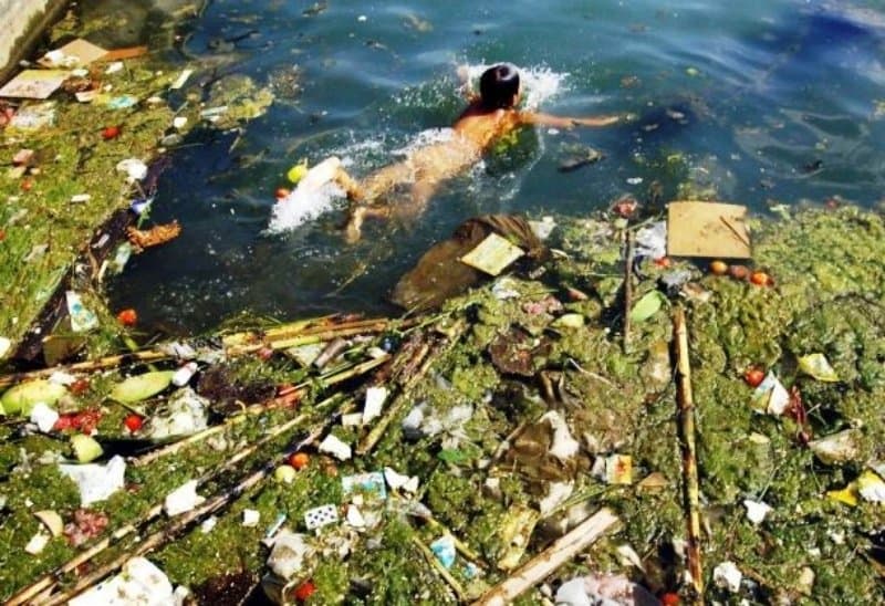 Nesta imagem triste, uma criança é capturada em um reservatório poluído de Pingba.