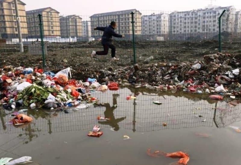 Aqui podemos ver a exibição perturbadora de um menino pulando por cima de pilhas de lixo e água escura enquanto brincava em Jiaxing.
