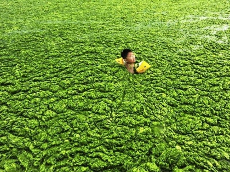 Essas densas florações de algas foram causadas pelo excesso de escoamento das operações agrícolas em Qingdao. Elas inundaram os rios, onde muitos moradores costumavam nadar.