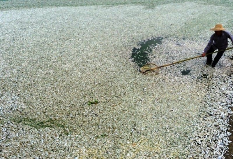 Aqui podemos ver um homem esperando remover o peixe morto que cobre o topo de um rio. Seu trabalho é em vão, portanto, como não está ajudando.