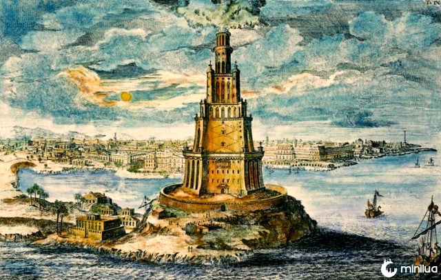 - Farol: construído em Alexandria, serviu para guiar os navios ao porto da cidade, no século 3 a.C. De noite acendiam um fogo dentro da torre do farol, de dia a fumaça é que indicava a direção para onde seguir. Chamado de Farol de Alexandria, é considerado a sétima maravilha do Mundo Antigo. Foi o primeiro farol conhecido no mundo, e funcionou por mais de 1500 anos.