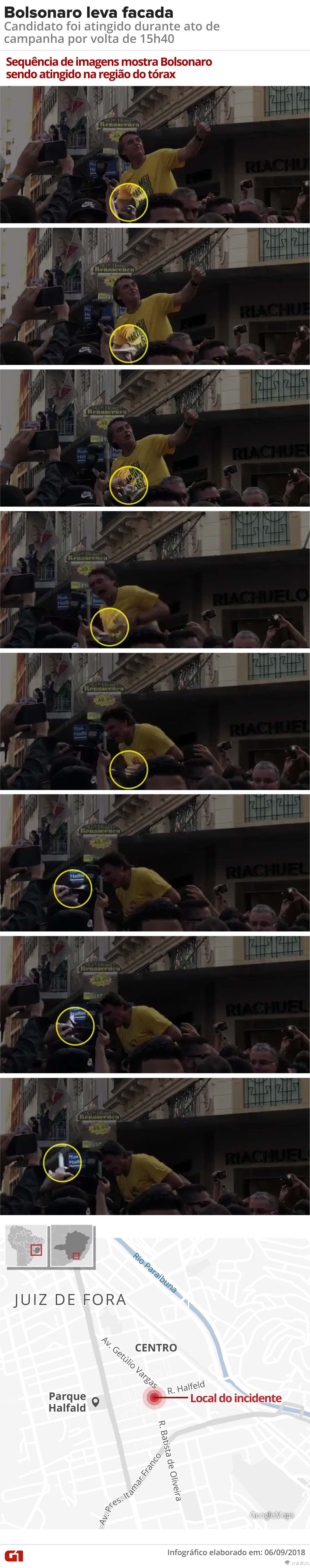 No momento do ataque, Bolsonaro estava sendo carregado por seus apoiadores nos ombros quando um homem se aproximou de onde ele estava e perfurou sua barriga com uma faca. Acredita-se que ele tenha sido rapidamente afastado por populares que conseguiram evitar uma fatalidade maior ao candidato.