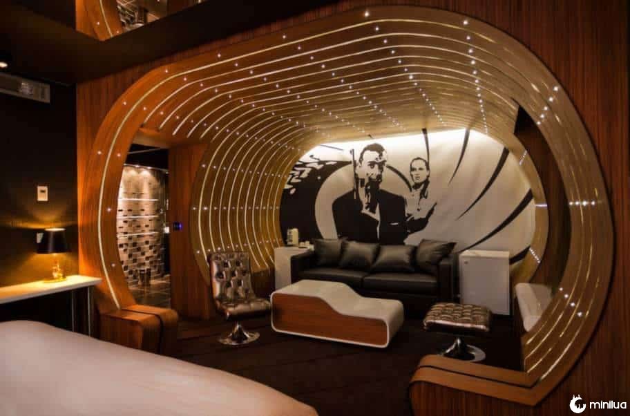 Um quarto de hotel com tema de James Bond pode ser o lugar mais legal, não acha? Será que tem algum botão secreto debaixo de alguma cadeira ou mesa que abre salas escondidas?