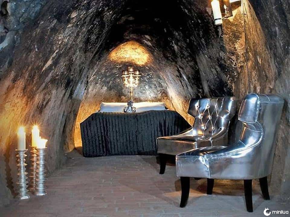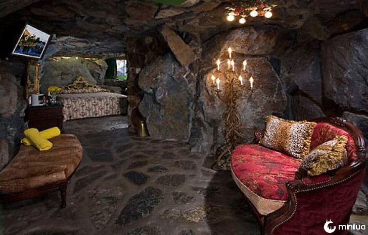 Não sabemos se este é um projeto pós-moderno, uma sala construída a partir de uma caverna real, ou se é uma suíte de hotel com o tema dos Flintstones .