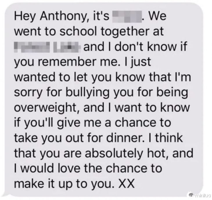 Oi Anthony, eu sou xxxx. Fomos à escola juntos e não sei se você se lembra de mim. Eu queria lhe dizer que sinto muito por ter debochado de seu excesso de peso, e queria saber se você me deixaria convidá-lo para jantar. Acho que você parece absolutamente bem e gostaria que me desse a oportunidade de compensar isso. Beijos "