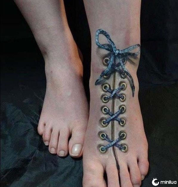 Você teria que andar descalço ou em chinelos para as pessoas apreciarem os laços tatuados em seu pé. Damos elogios ao artista que construiu a profundidade nos anéis de renda com uma série de sombras que tornam isso tão realista.