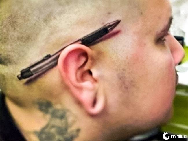Talvez esse cara goste de desenhar ou escrever e quer que todos saibam. Mas a parte mais legal dessa tatuagem é que a caneta lança uma "sombra" sobre a cabeça dele, dando-lhe aquela sensação de 3D, que faz você querer pegar aquela caneta.