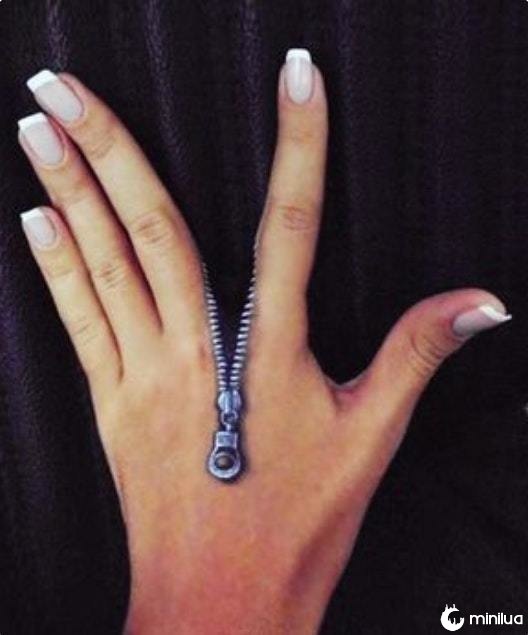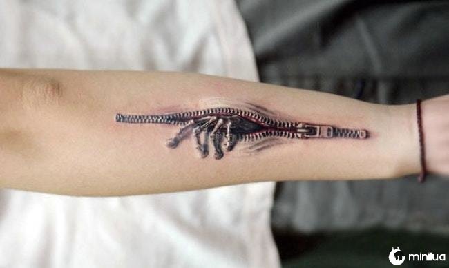 Nunca vimos um zíper em forma de tatuagem que seja tão chocante quanto este. Além disso, o fundo preto dá a ilusão extra de que a mão está dividida quase pela metade. E o zíper parece parece muito realista.